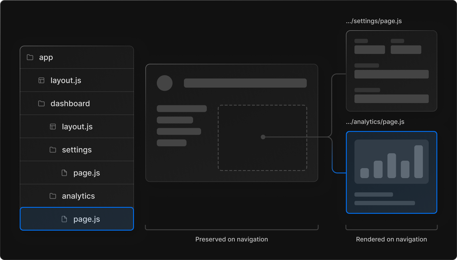 CRA에서는 레이아웃 컴포넌트 하단에 라우터를 네스팅해두어서 대응했던 걸 내장에서 처리할 수 있는 아주 유용한 기능이다. (문서에서는 이 전략을 Partial rendering이라고 한다.)