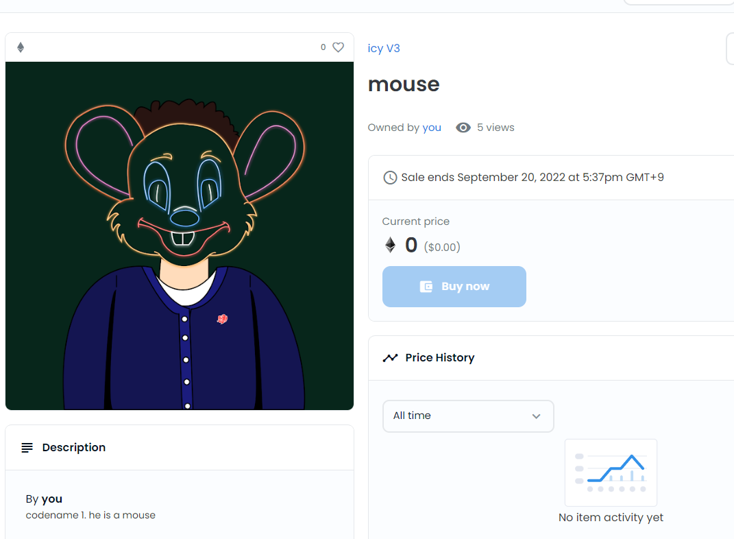 그런데 NFT는 이미지만 있는게 아니죠. 프로젝트명이나 설명도 같이 있어야합니다. 예를 들어, 이건 제가 시험삼아 테스트넷에 배포한 NFT입니다.