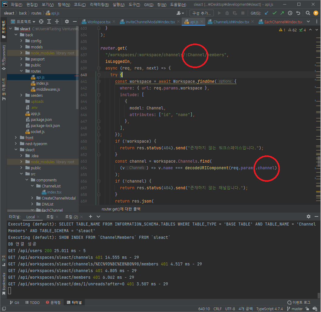 알고보니 req.params.channel과 라우터에 URI로 써준 channel 부분이 대문자, 소문자 차이가 있었다.