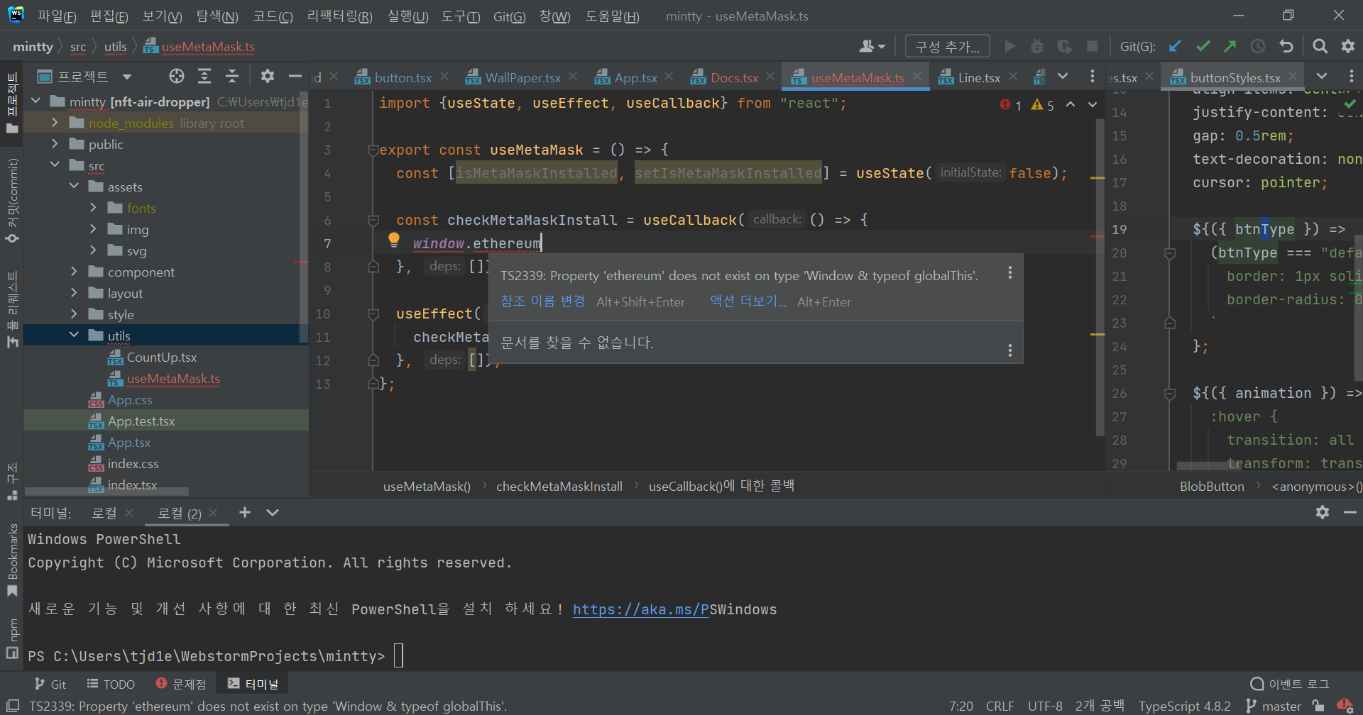 window.ethereum을 올바르지 않은 객체 접근이라고 뜬다.