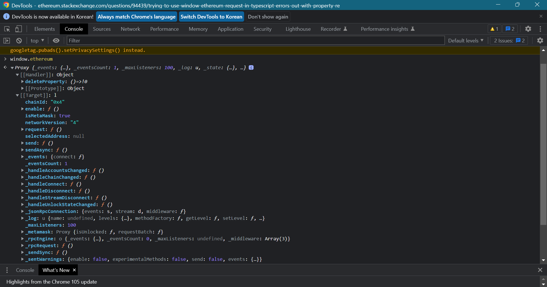 다음에 한번 포스팅하긴 할거지만, window.ethereum 객체는 chrome의 MetaMask를 확장 프로그램으로 설치했다는 걸 가정하고 실행한다.