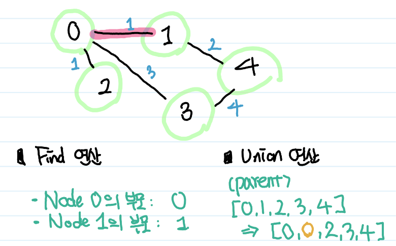 union - find 연산은 node의 부모가 다를때 각 노드의 부모를 갱신해주는 알고리즘입니다.