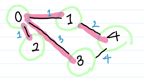 이런 노드들이 있다고 가정하면, 간선 [3 - 4]를 제외한 경로가 비용이 최소가 되는 경로입니다.