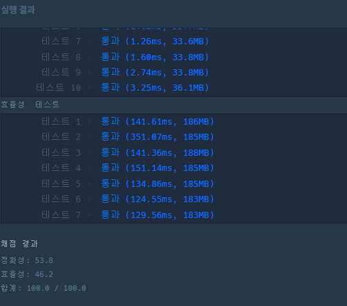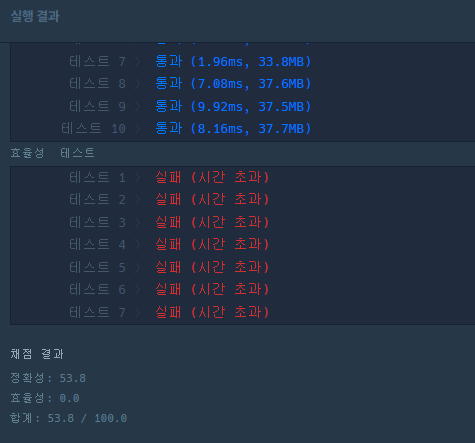 다만, 이 방법은 효율성 테스트에서 걸리게 설계 되어 있습니다.