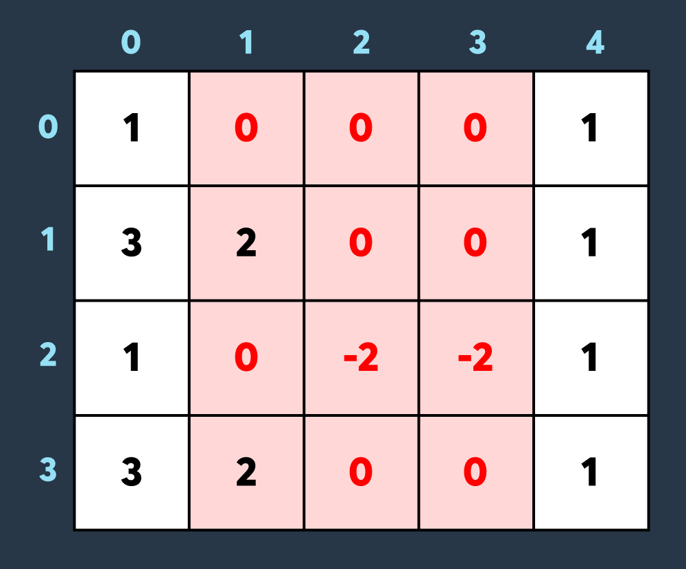 // (0, 0)에서부터 (2, 2) 까지 3을 빼고 싶다면?