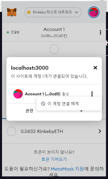 특정 주소에서 연결이 된 정보를 metamask 쪽에서 계속 가지고 있기 때문에 로그 아웃 처럼 처리를 해주기 위해서는 직접 메타마스크에서 처리를 해줘야한다.