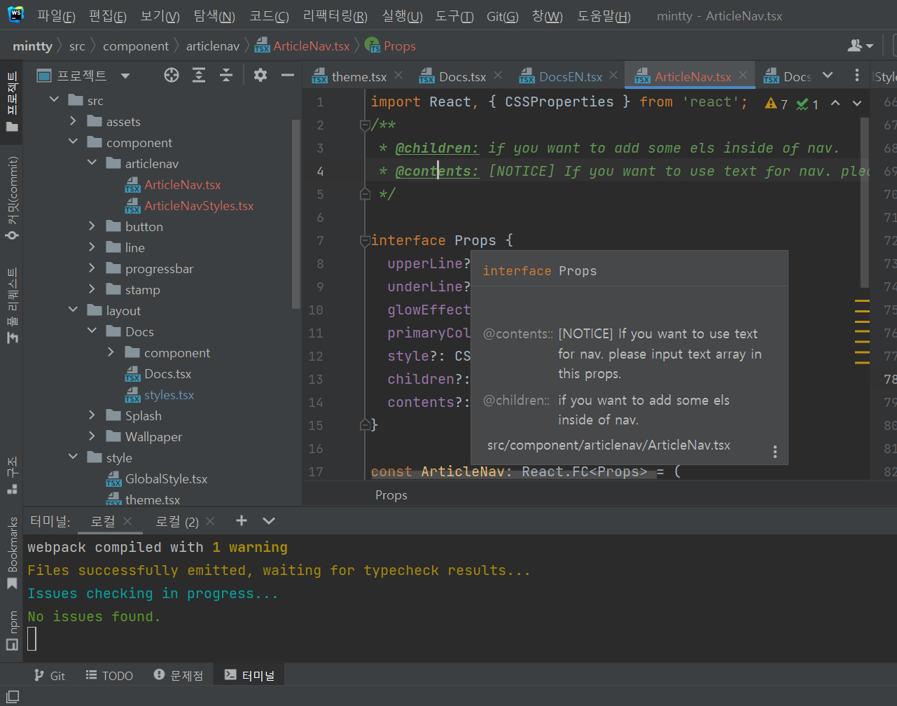 그리고 그 안에서 @를 사용하면 해당 컴포넌트에서 쓰이는 interface props의 간단한 설명을 같이 넘길 수 있다.