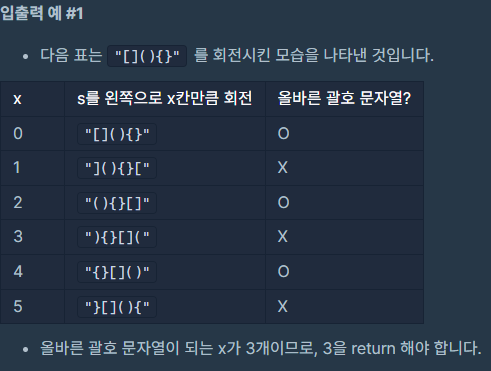 대괄호, 중괄호, 그리고 소괄호로 이루어진 문자열 s가 매개변수로 주어집니다. 이 s를 왼쪽으로 x (0 ≤ x < (s의 길이)) 칸만큼 회전시켰을 때 s가 올바른 괄호 문자열이 되게 하는 x의 개수를 return 하도록 solution 함수를 완성해주세요.