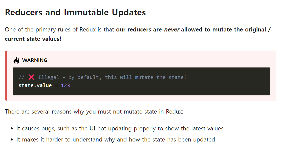 그러니 꼭 spread 연산자를 쓰거나 filter 함수같은 걸 써서 state를 새로 만들어줘야한다.