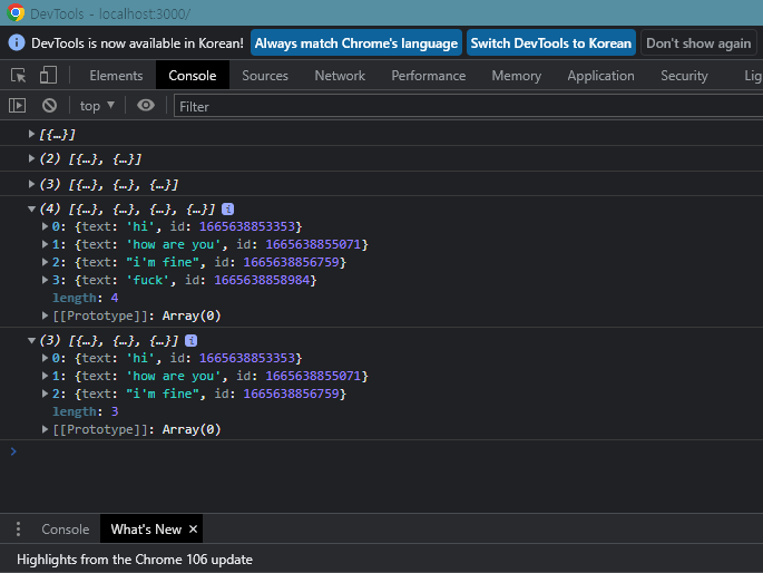 기존 object에서 뭔가 변화가 생겼다면 spread 연산자를 쓰거나 filter 함수를 써서 새로운 object로 만들어주자.