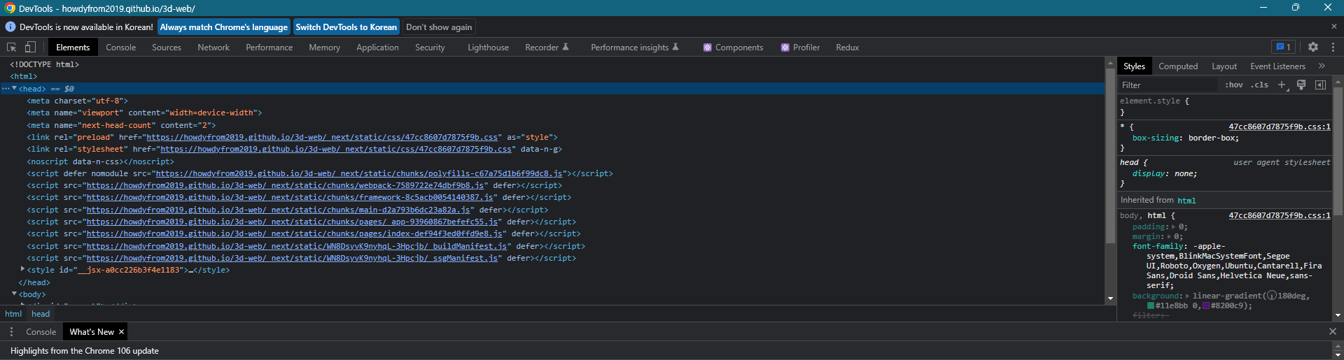 놀란 마음에 개발자 도구를 살펴보니 빌드된 프로젝트의 index.html에서 불러오는 js 파일이나 스타일시트, img 태그의 소스 등 많은 요소의 경로가 문제였다.